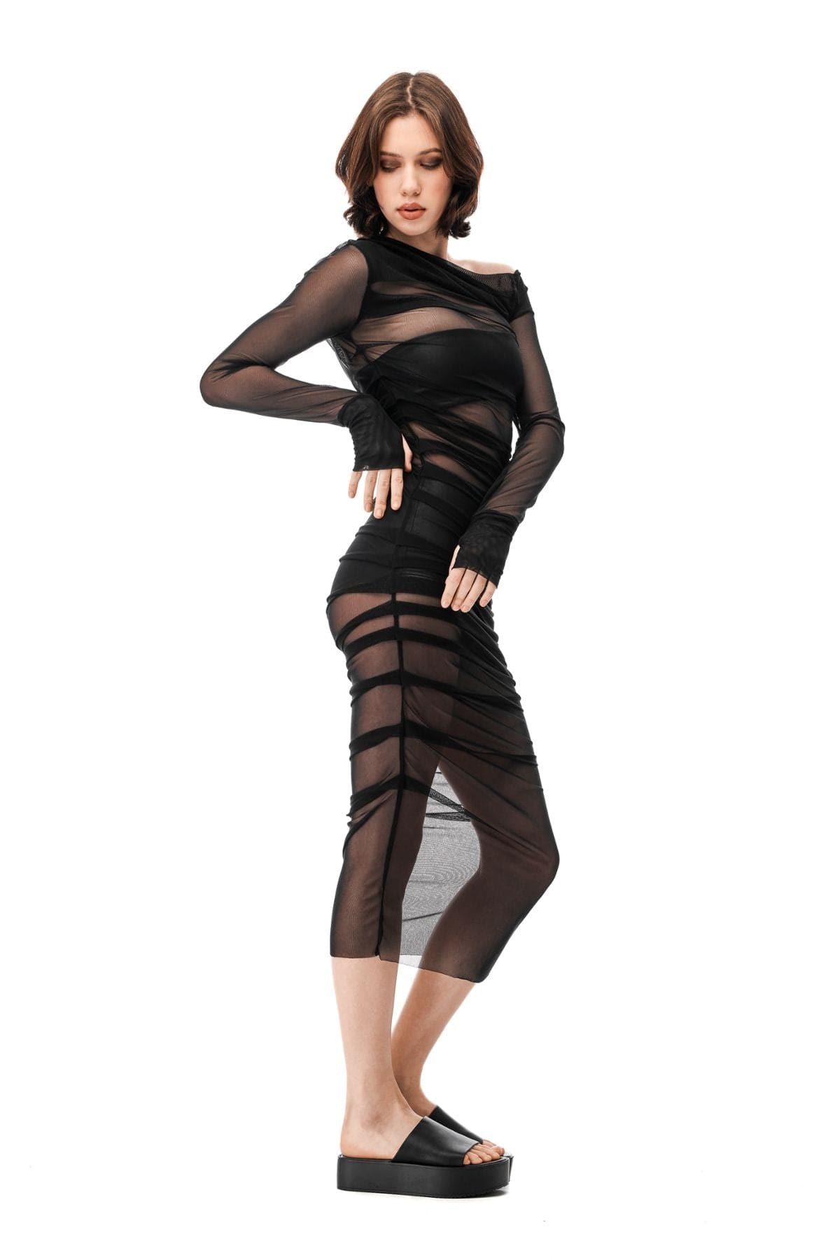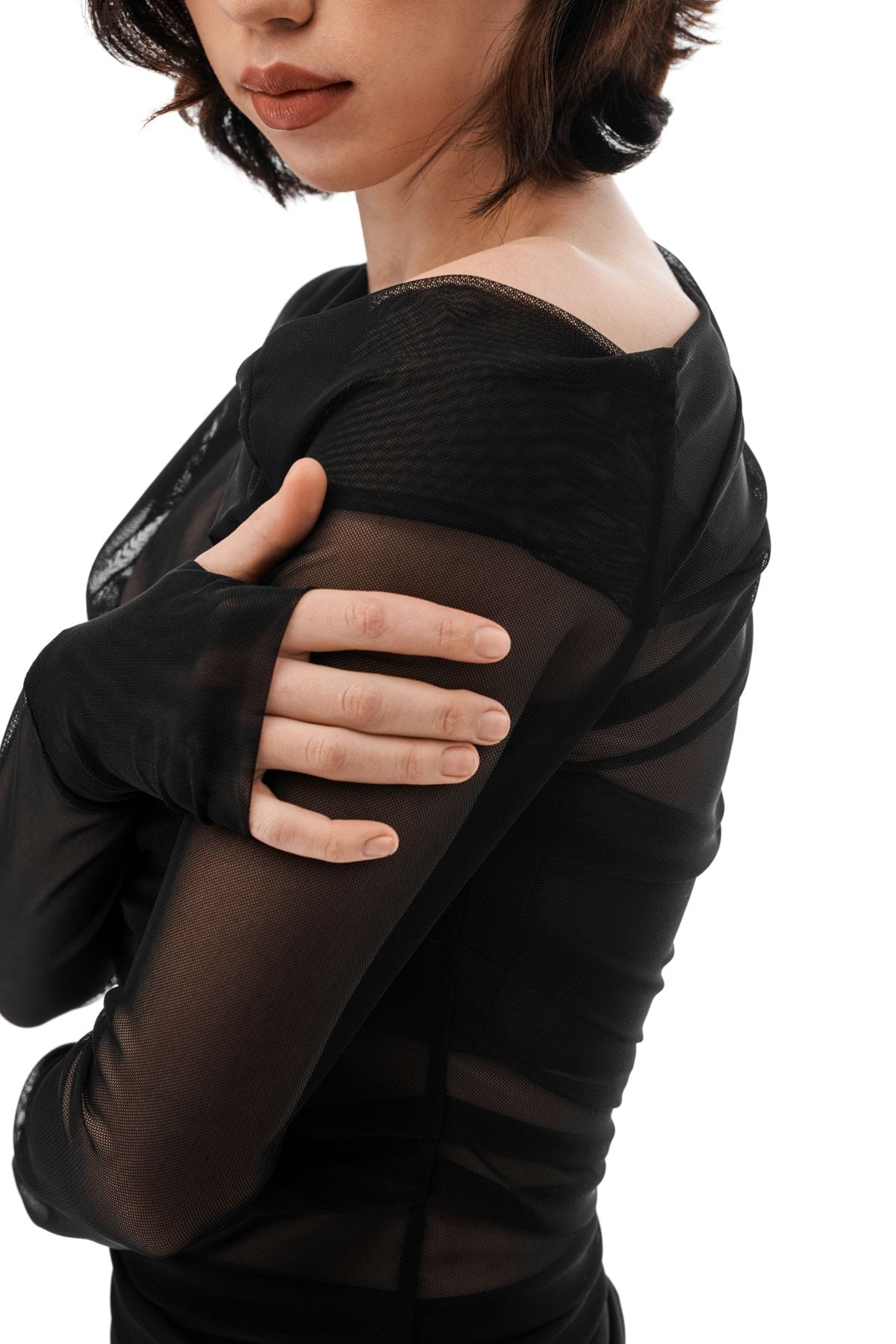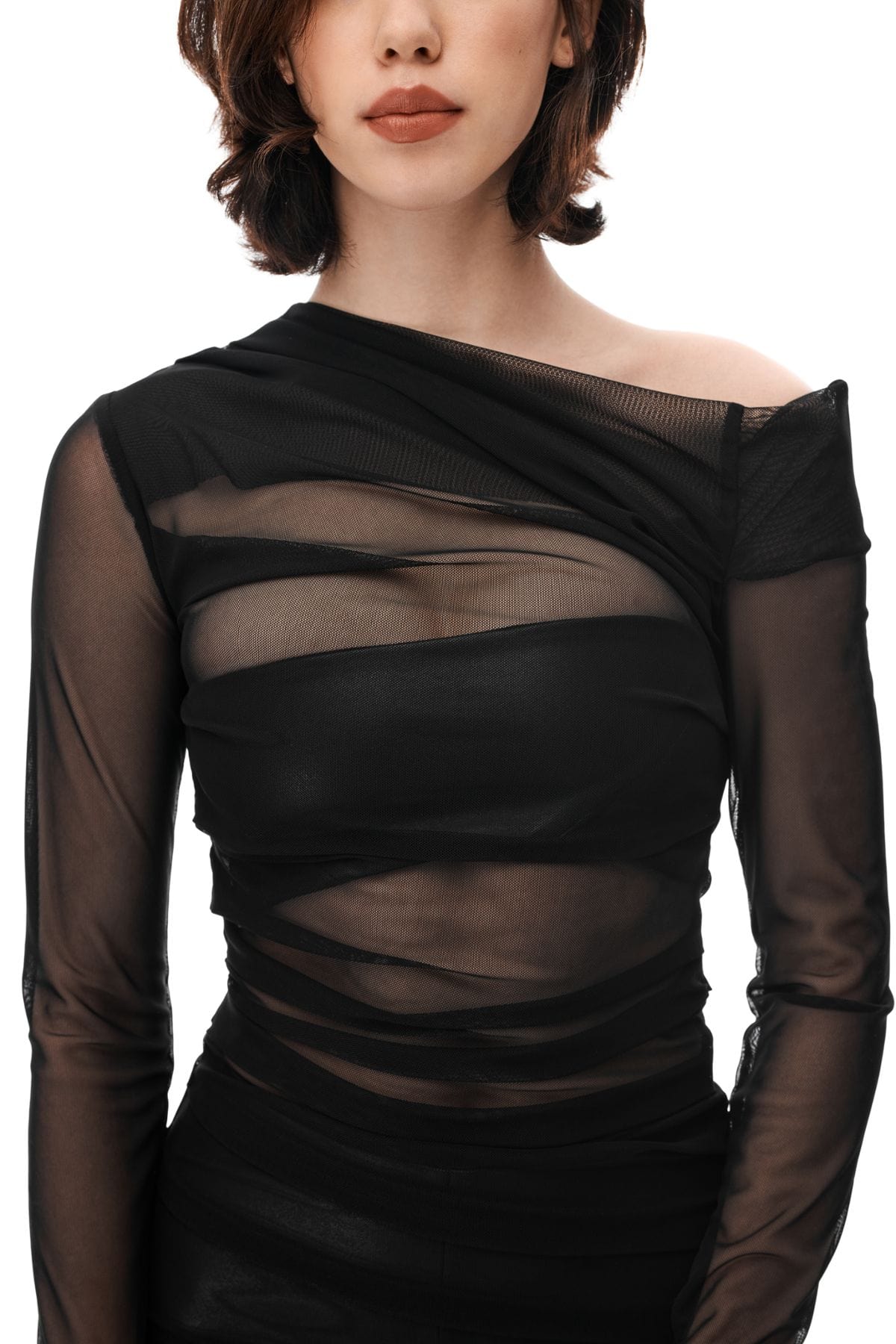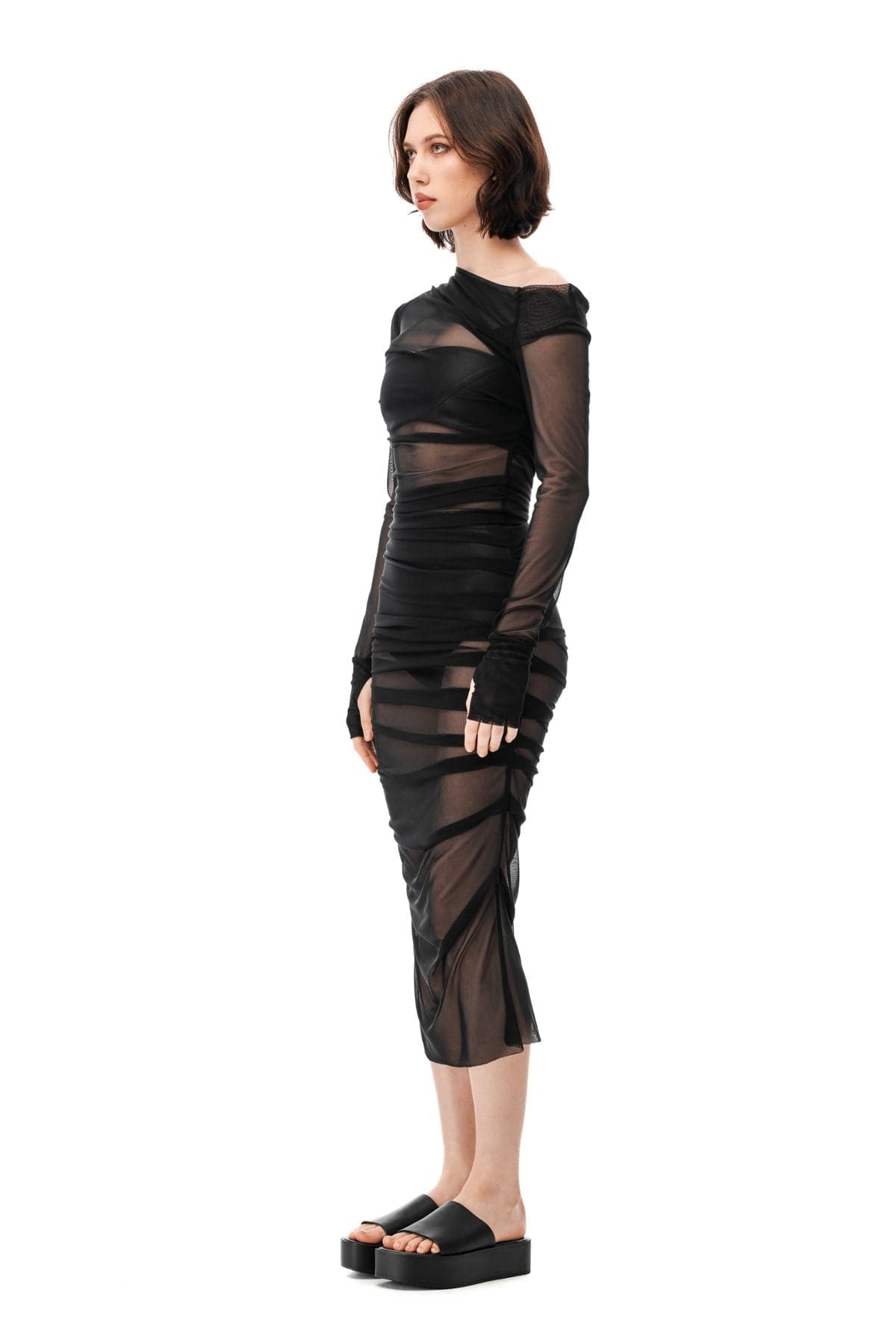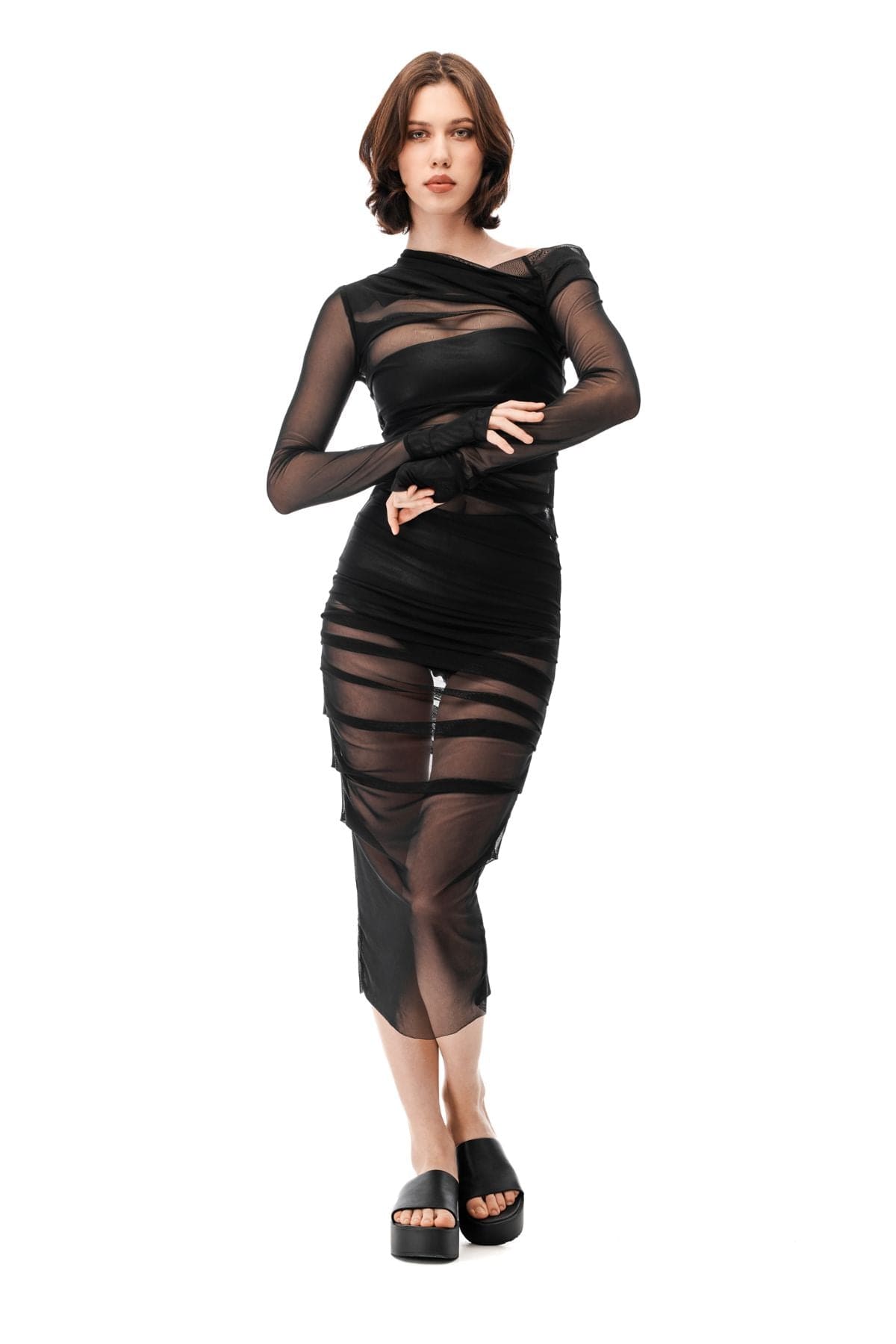 This elegant fitted midi dress brings a femme-fatal vibe to your wardrobe. Designed to accentuate your body’s beautiful lines, it features thumbhole cuffs, rhythmically placed pleats, and an asymmetrical neckline that flirtatiously exposes one shoulder. It is a manifestation of powerful femininity through delicacy. Dare to wear it as we suggest with shorts and a top, and you won’t forget that feeling.