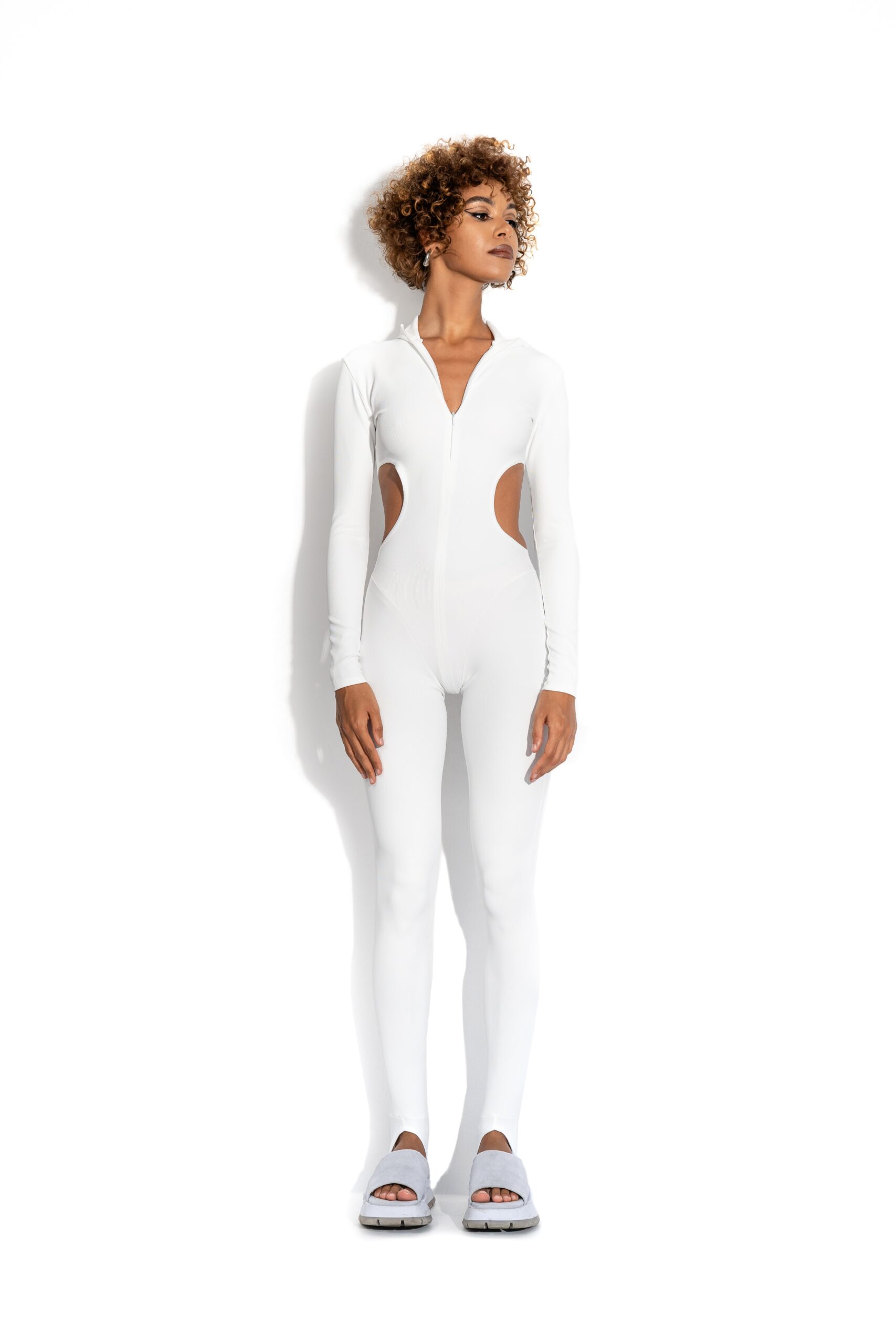 This fitted bodysuit, crafted from enveloping biflex viscose fabric, features a hood, side cutouts, and a front zip closure. Wear it fully zipped for a sleek, streamlined look, or unzip it to reveal a seductive plunging neckline.