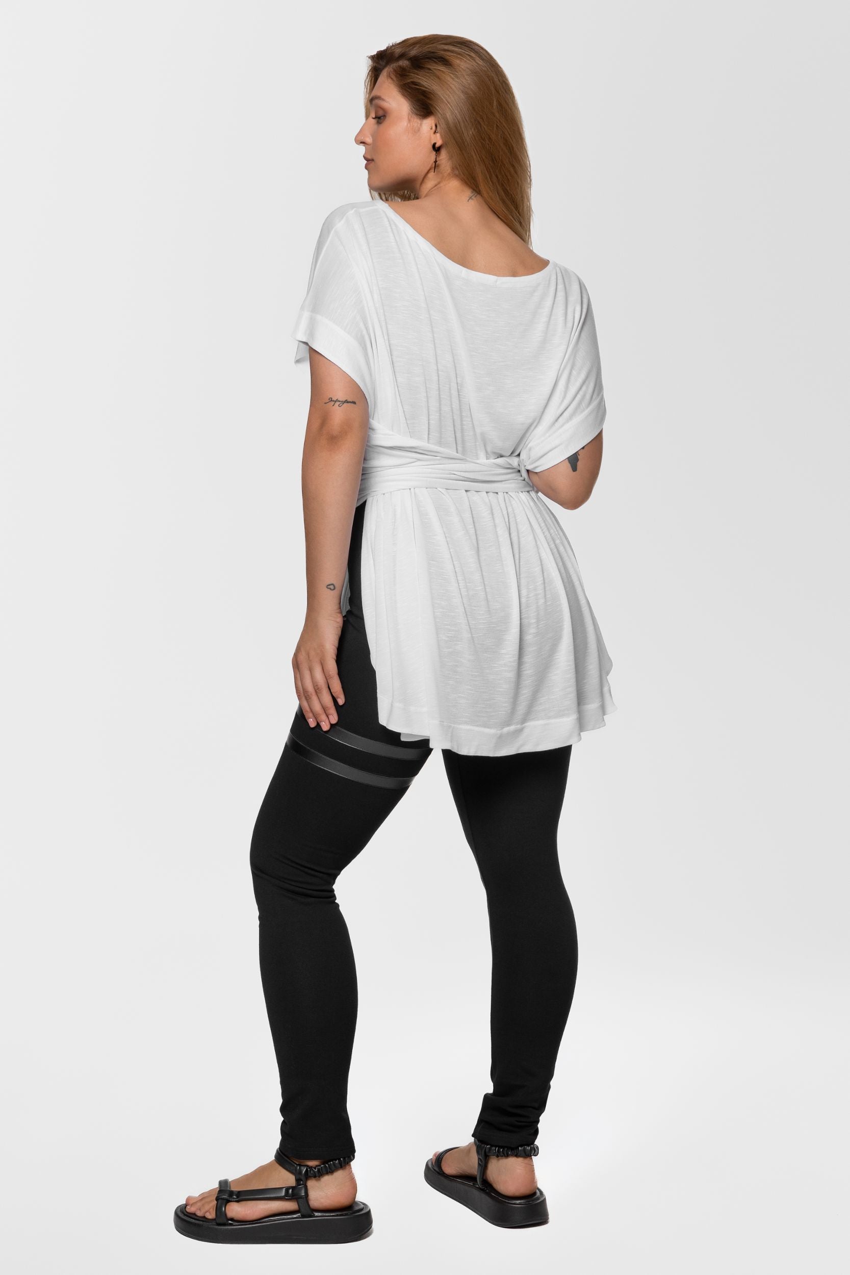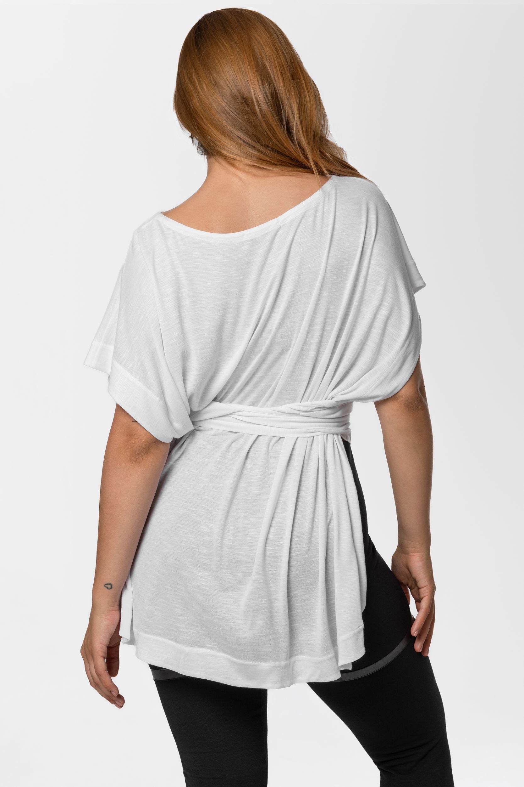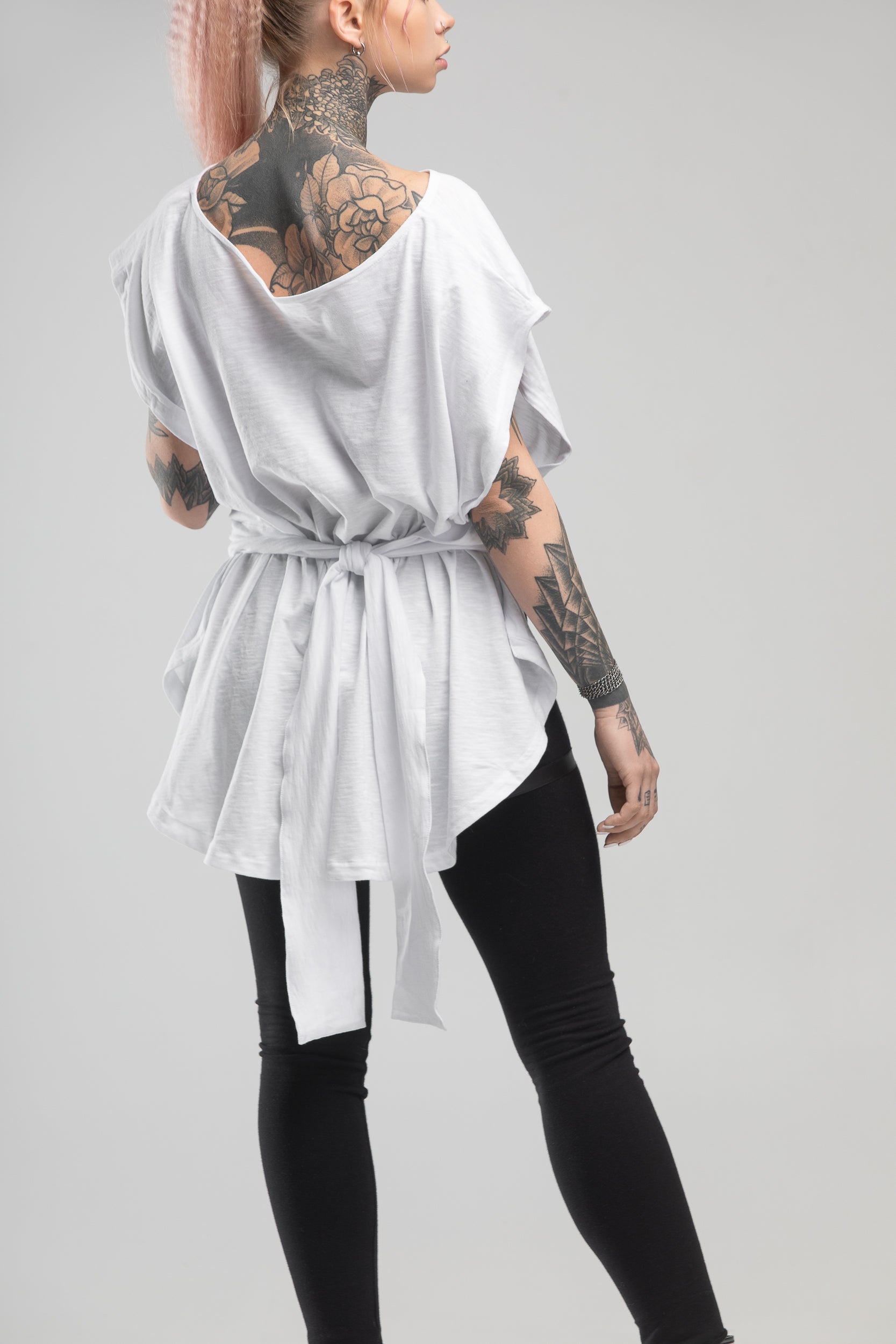 Get ready to get going in this slouchy pullover shirt that will fire you with enthusiasm. This easygoing singlet with dropped armholes is invented for ladies who always wear something fresh to the next party and opt for assembling dynamic street-style outfits. Designed to tie on the back, it forms notably lowered armholes and covers you with a drapey layer. Cut from pure cotton to feel exquisitely soft and cozy, this white slip-on blouse features a wider neckline and dropped shoulders. Tactile and inspirational, it gathers at the lower back to create a subtle ruffle decoration. But you can style it in numerous ways - wear it on one shoulder, with deeper back cleavage and a high boat line on the front, or drape the fabric further on the front to achieve a lower front cleavage. For a more daring look, drop the tie-knot and wear the shirt loose.