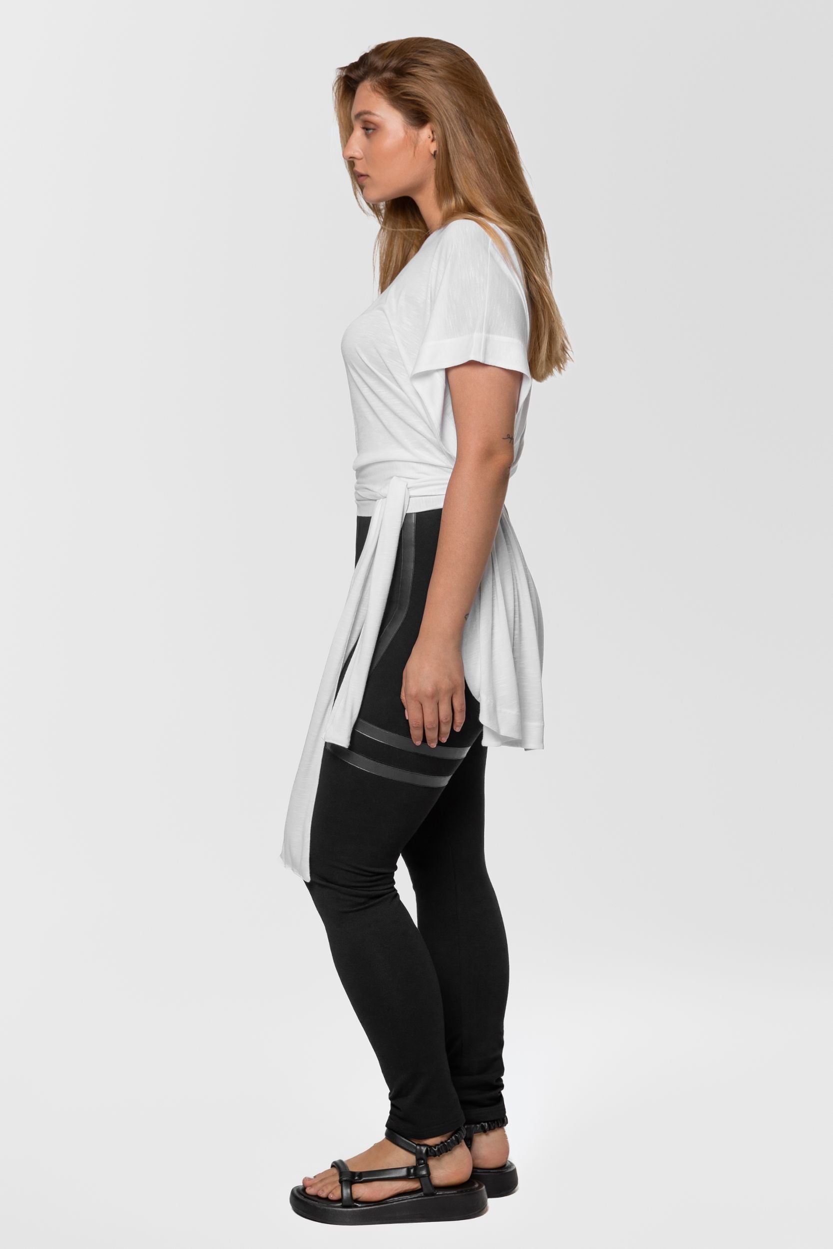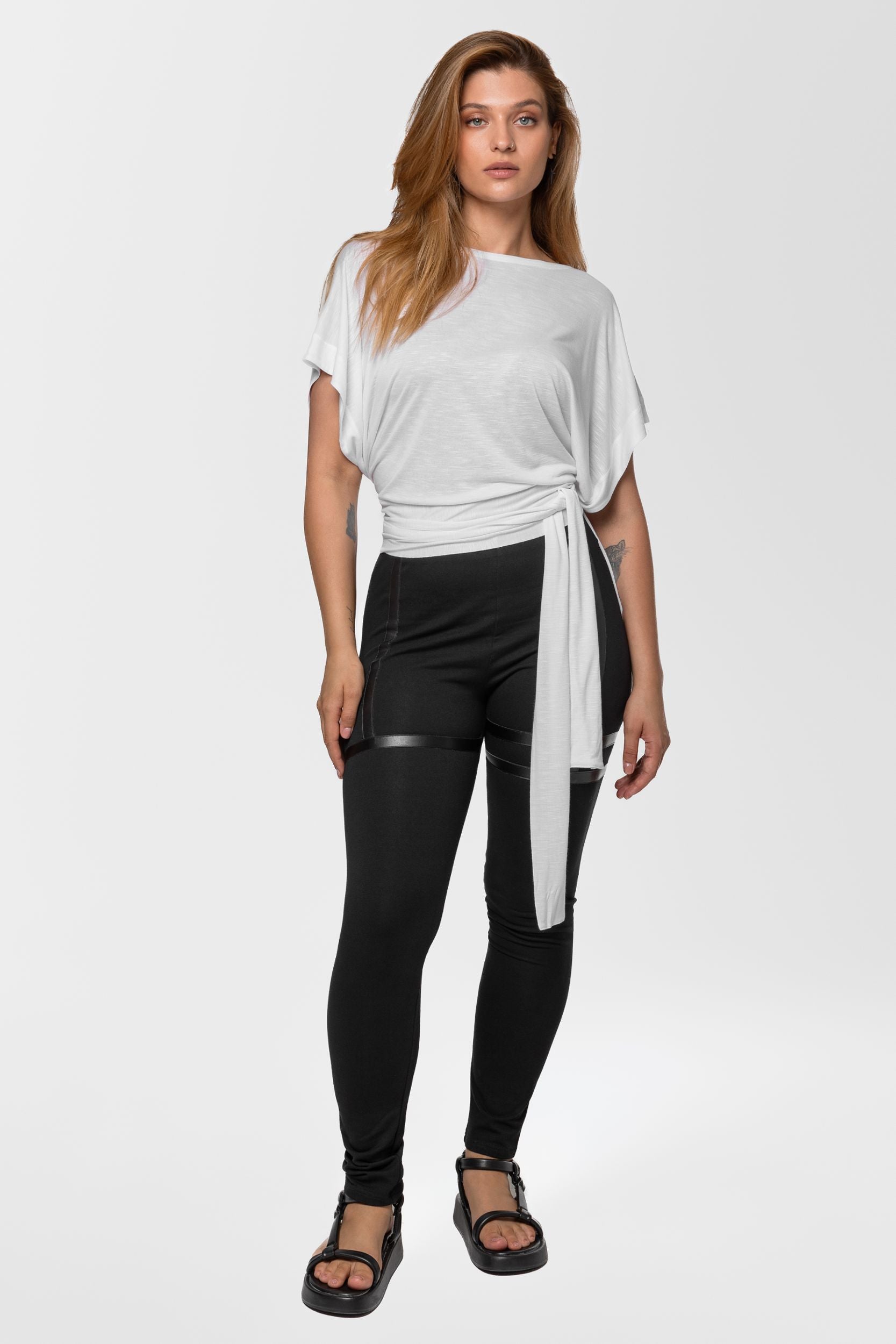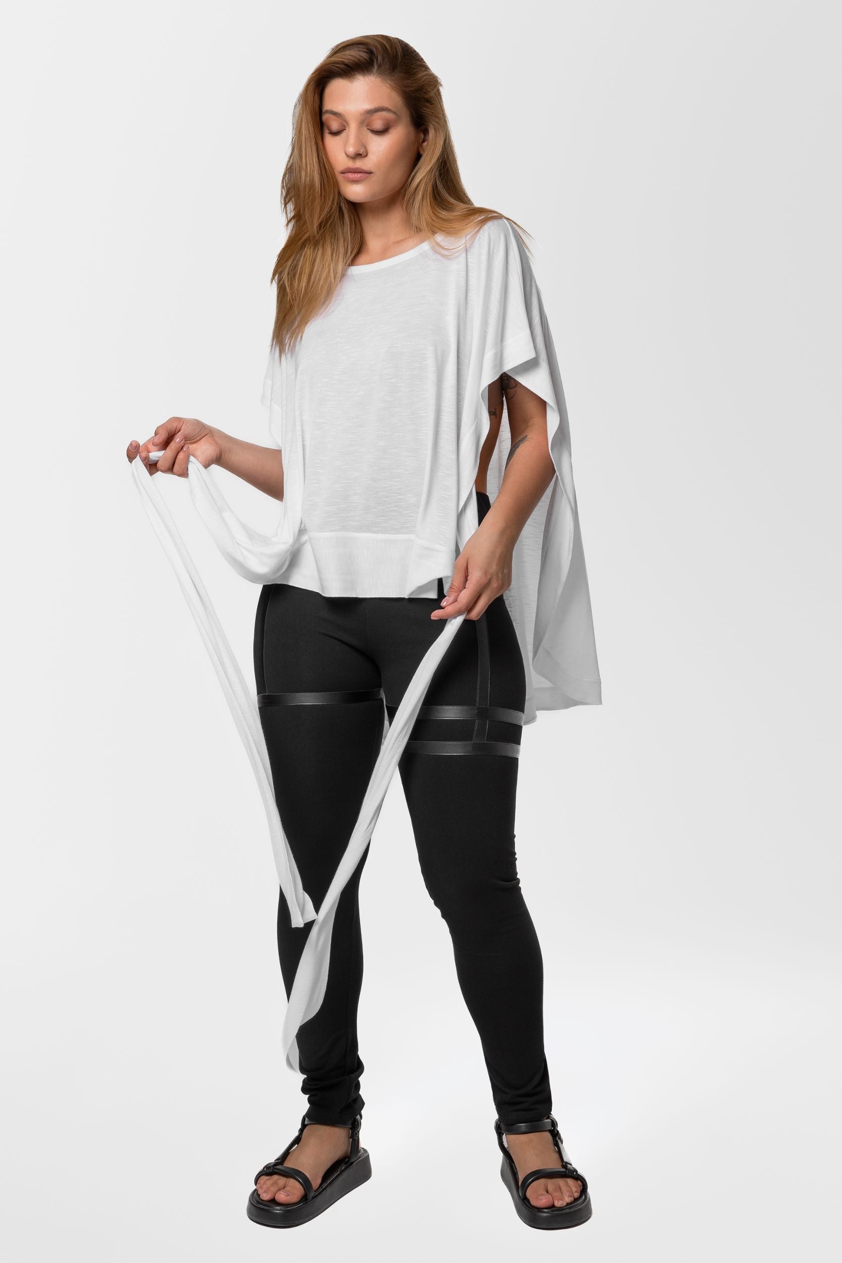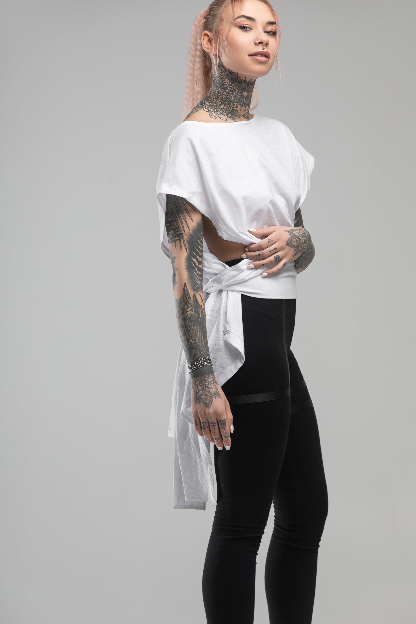 Get ready to get going in this slouchy pullover shirt that will fire you with enthusiasm. This easygoing singlet with dropped armholes is invented for ladies who always wear something fresh to the next party and opt for assembling dynamic street-style outfits. Designed to tie on the back, it forms notably lowered armholes and covers you with a drapey layer. Cut from pure cotton to feel exquisitely soft and cozy, this white slip-on blouse features a wider neckline and dropped shoulders. Tactile and inspirational, it gathers at the lower back to create a subtle ruffle decoration. But you can style it in numerous ways - wear it on one shoulder, with deeper back cleavage and a high boat line on the front, or drape the fabric further on the front to achieve a lower front cleavage. For a more daring look, drop the tie-knot and wear the shirt loose.