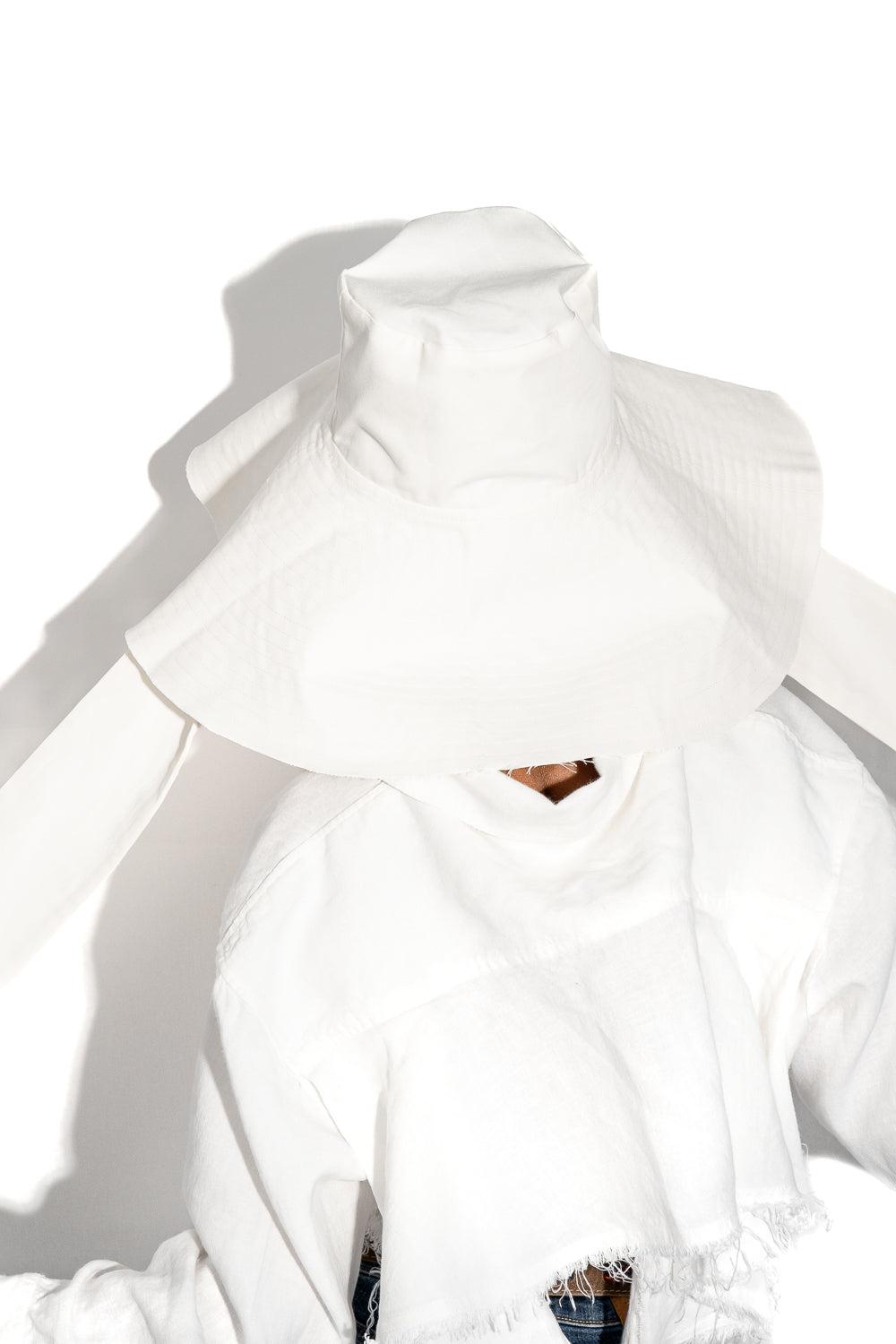 Chic linen hat with a wide brim and extra-long ties that can be functionally tied in a windy place or left to flow down decoratively.